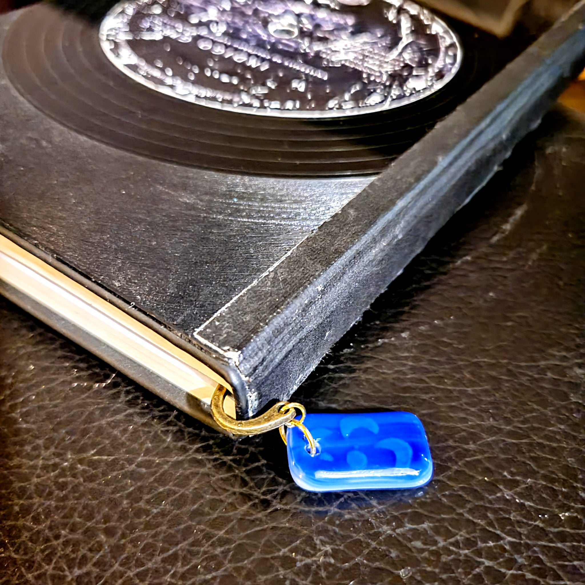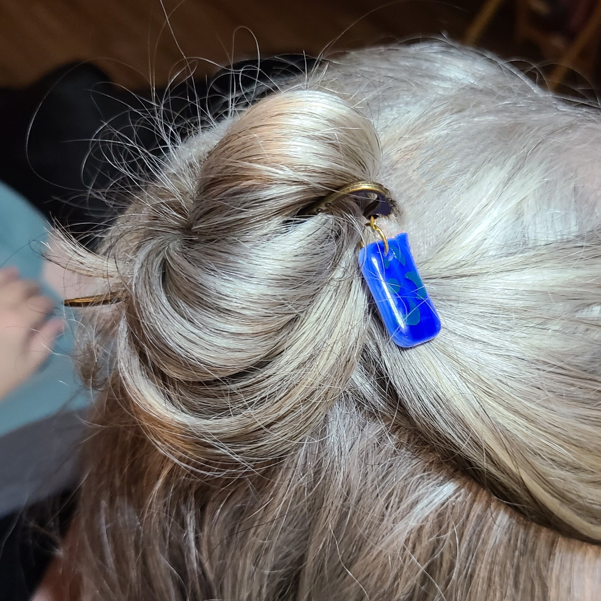 It can be a bookmark, or it can be a hairpin! Bronze painted flat steel with a pretty blue fused glass rectangle on the end.